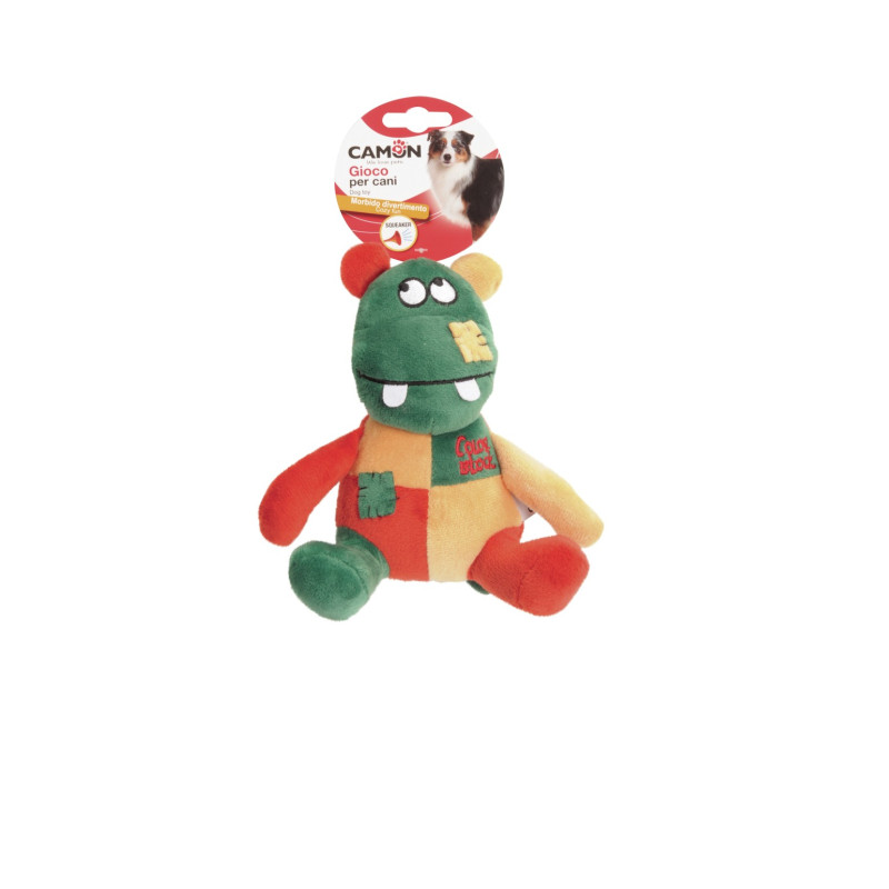 Jouet amusant et coloré pour chiens en forme de dinosaure en peluche.